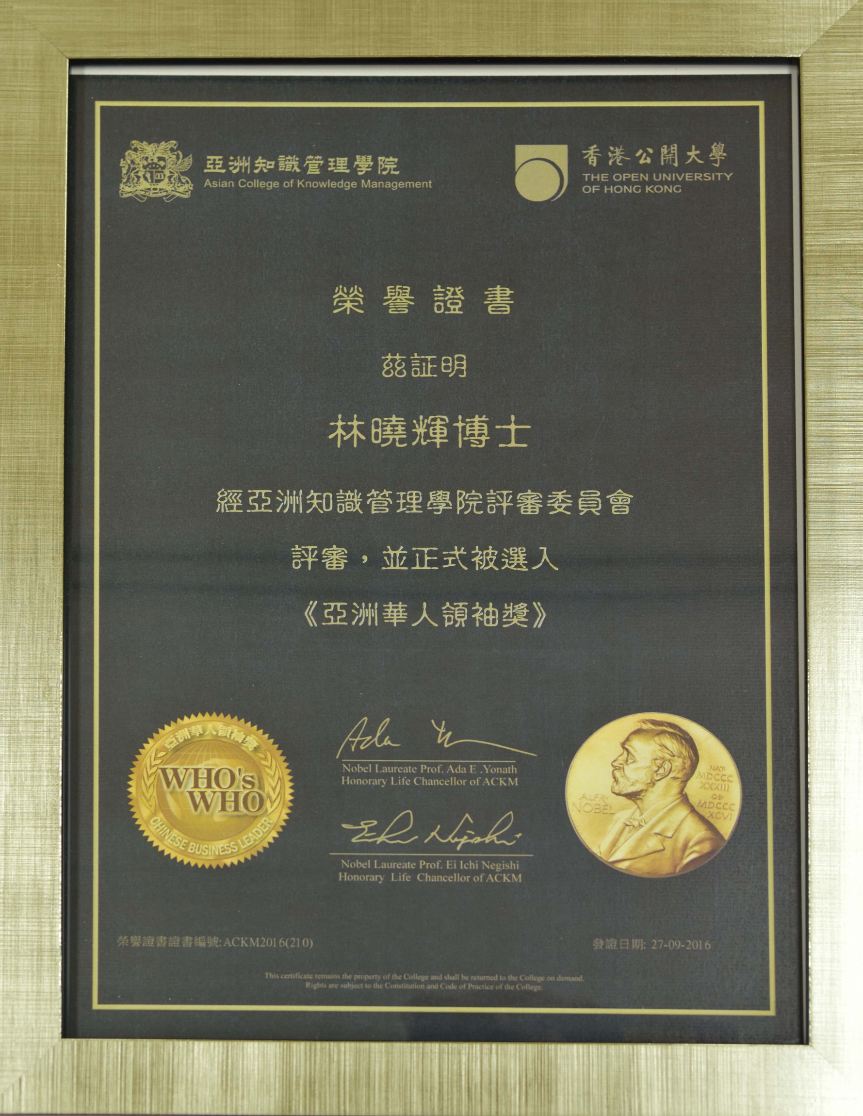 2016年 亞洲華人領袖獎 (林曉輝博士)