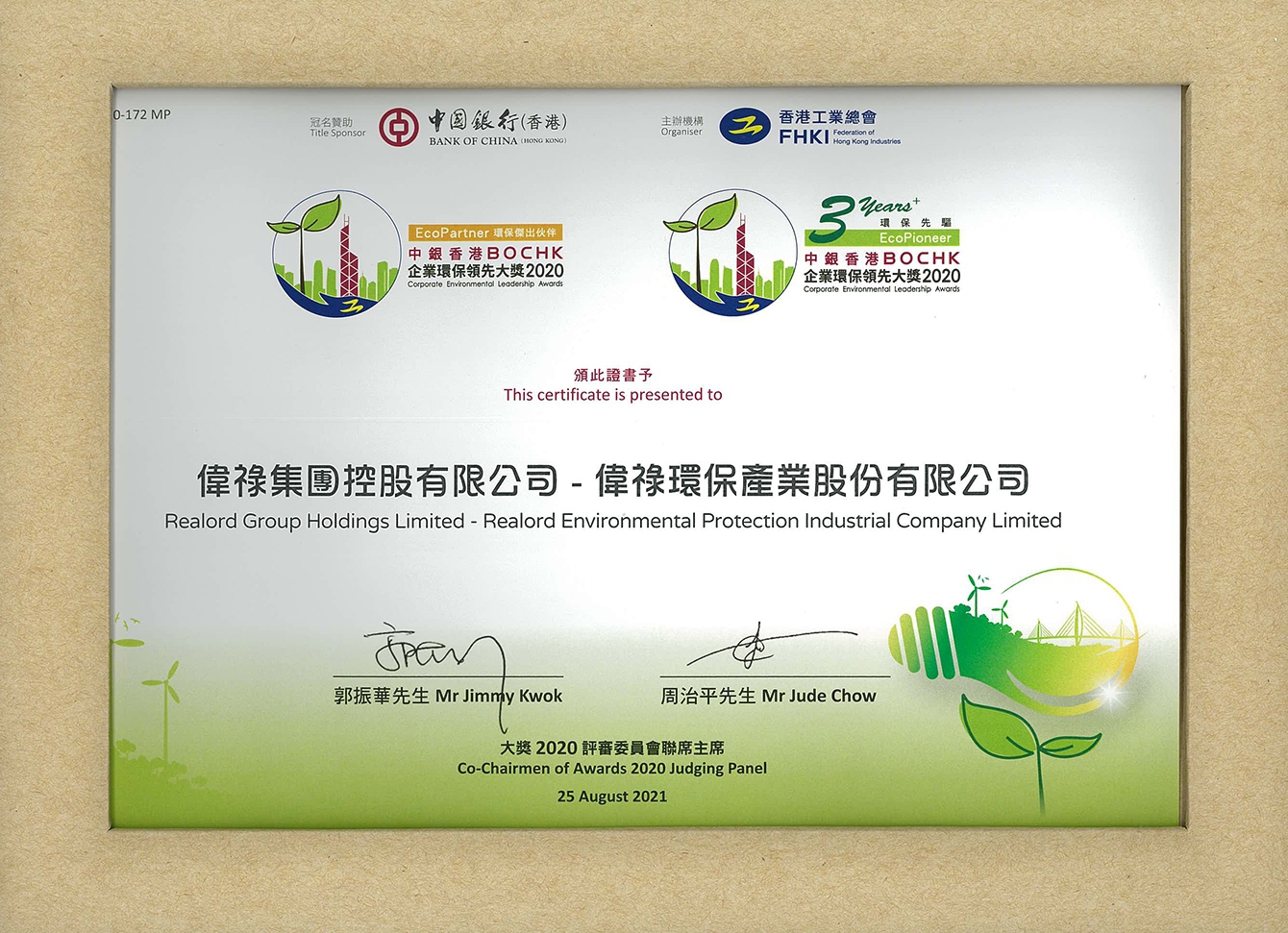 中銀香港企業環保領先大獎2020 - 環保傑出夥伴 及 環保先驅獎